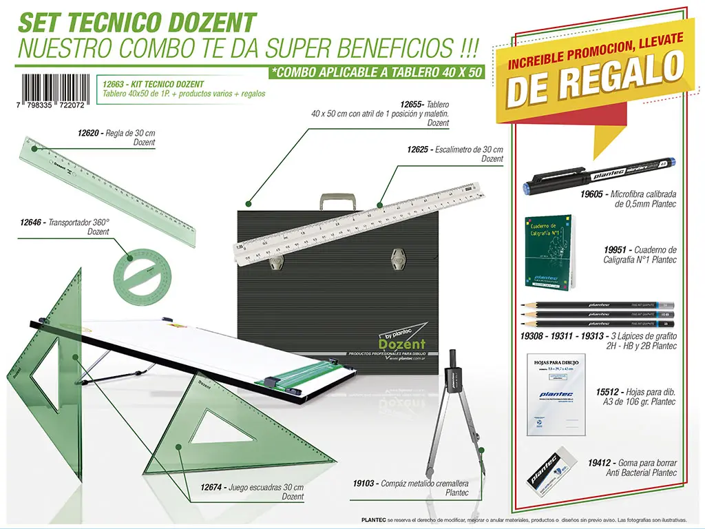 Descubre el KIT COMPLETO DE DIBUJO TÉCNICO DOZENT by PLANTEC, diseñado para satisfacer las necesidades de estudiantes y profesionales del diseño. Este set incluye un tablero dozent con atril de 40x50 cm, equipado con una paralela que garantiza precisión en cada trazo.