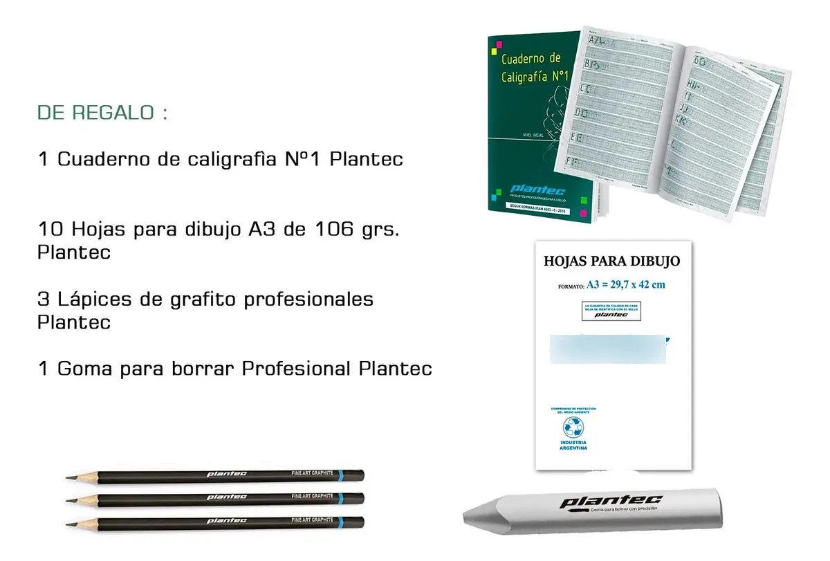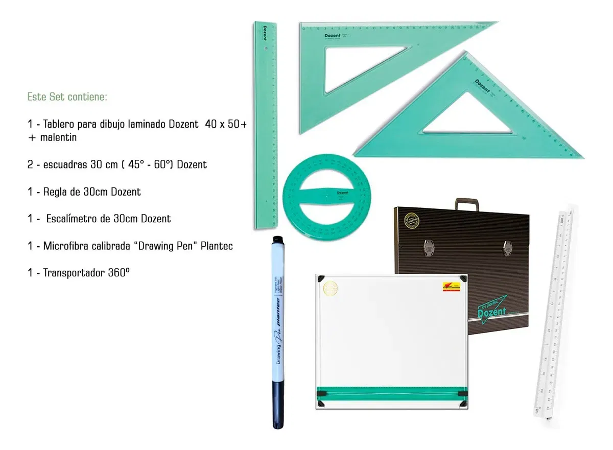 Este Kit contiene: 1. Tablero para dibujo 40x50 Laminado Dozent con Porta tablero y Regla Paralela 2. Escuadras de 30cm Dozent 1. Regla de 30cm Dozent 1. Escalímetro de 30cm Dozent 1. Microfibra graduada 0.5mm 1. Transportador 360º Dozent 1. Cuaderno de caligrafía Nº1 Plantec 3. Lápices de grafito Plantec (Según Disponibilidad) 10 Hojas para dibujo A3 de 106 grs. Plantec 1. Goma para borrar