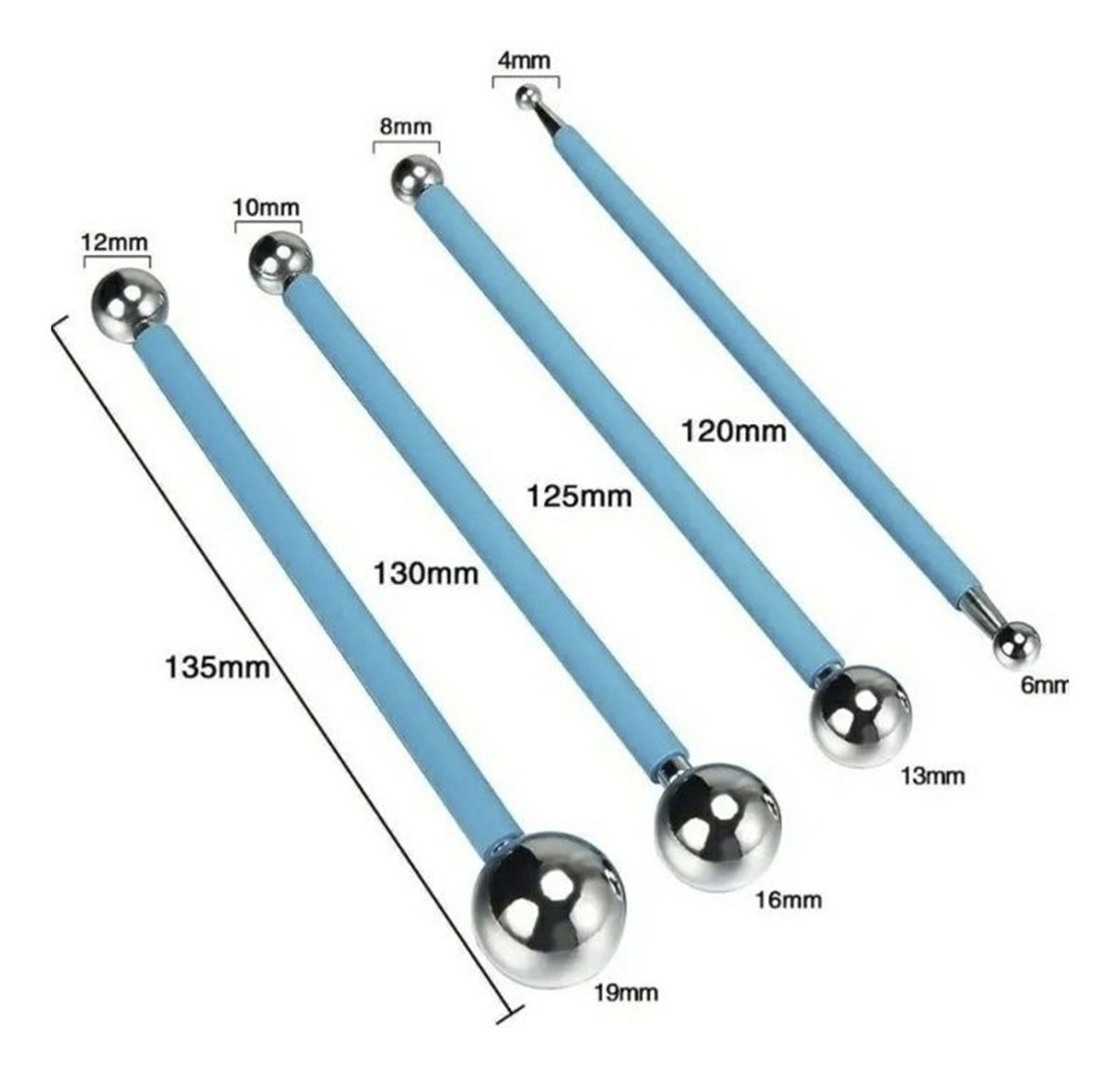 Descripción el set compuesto por 4 estecas bolillos, herramientas utilizada para modelar, con diferente medidas , serian 8 diferentes medidas de puntas que se utilizan en el modelado de masas medidas aprox: 13 cm largo.