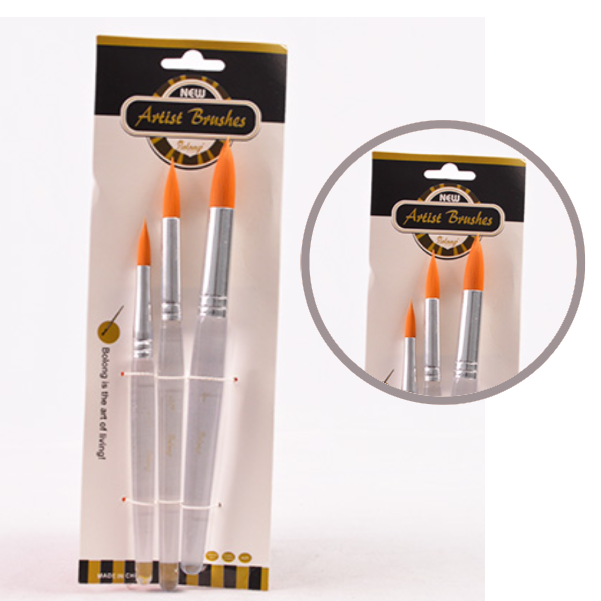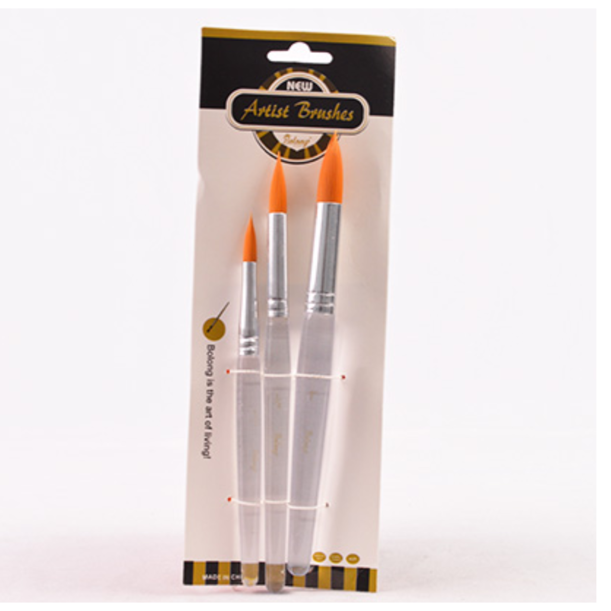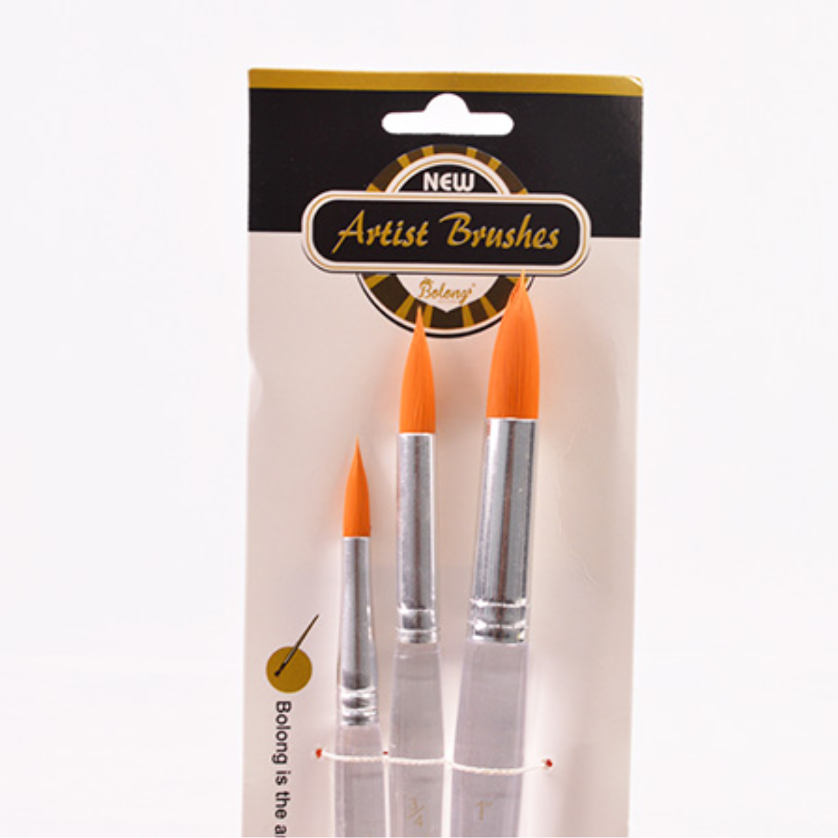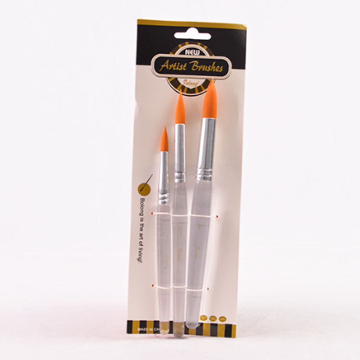 Pack de 3 pinceles artisticos medianosModelo: REDONDO - Medidas: 1/2" , 3/4" y 1"Largo aproximado: entre 16 y 19cmMango transparentePresentado en carton con bolsa transparente