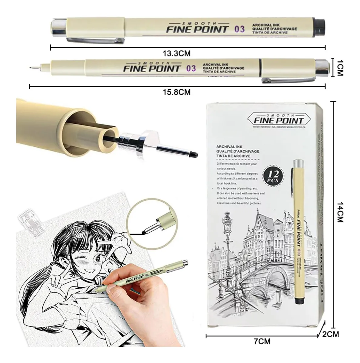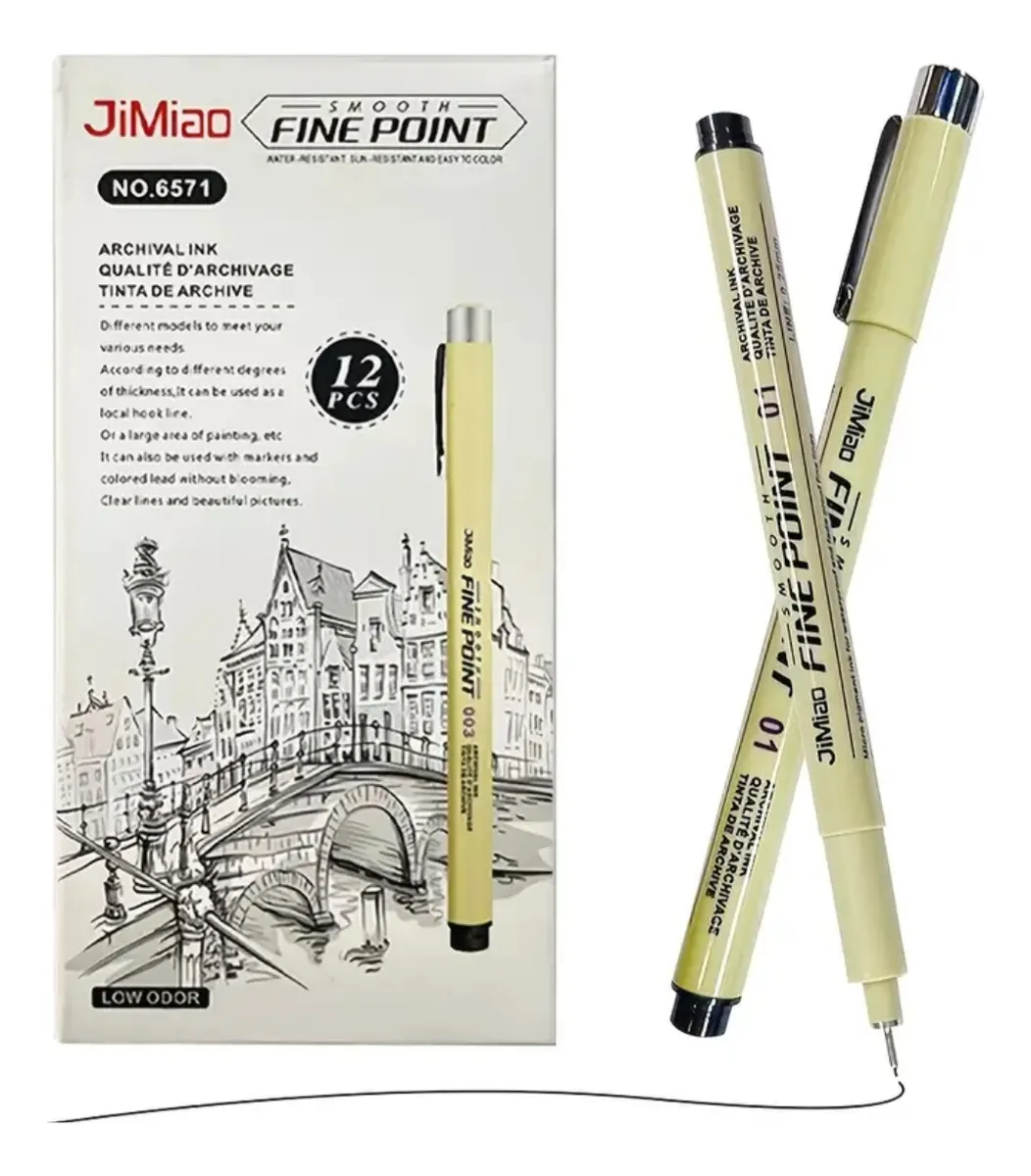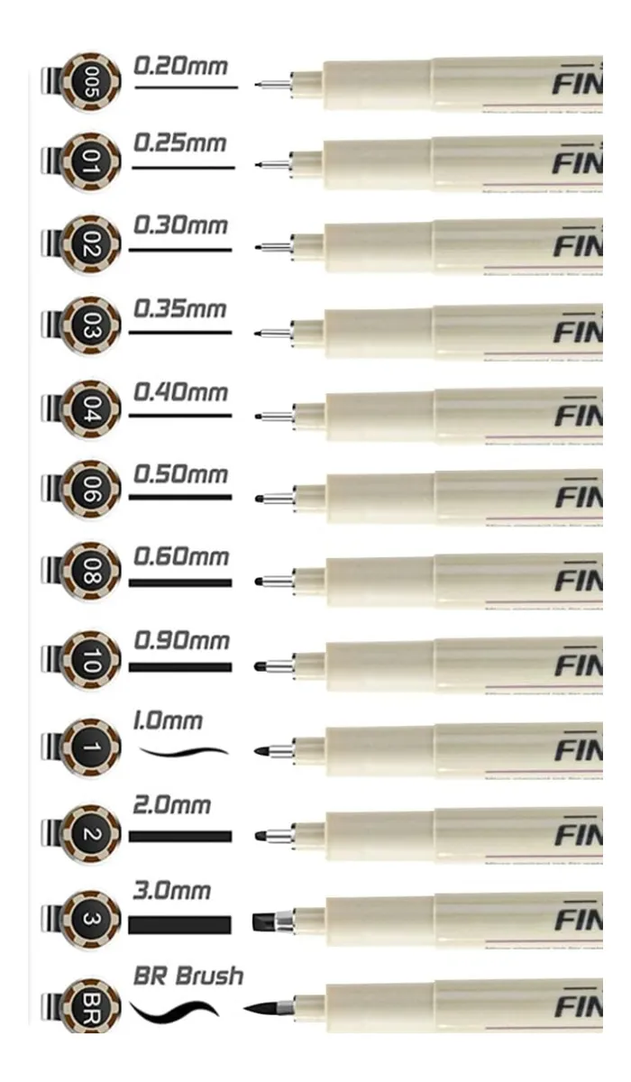 El kit incluye 12 estilografos de las siguientes graduaciones: 1_0,05 2_0,1 3_0,2 4_ 0,3 5_0,4 6_0,8 7_0,9 8_1.0 9_2.0 10_3.0 11_BRUSH 12_10