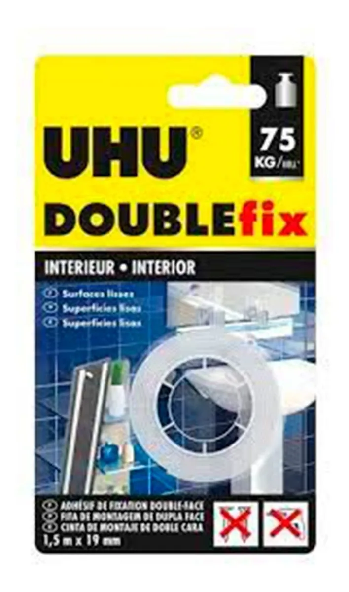 Adhiera UHU DOUBLEfix INDOORS en el objeto que desee sujetar sin crear bolsas de aire. Quite la película protectora sin tocar el adhesivo. Coloque el objeto en el lugar que desee y ejerza una gran presión sobre el mismo.