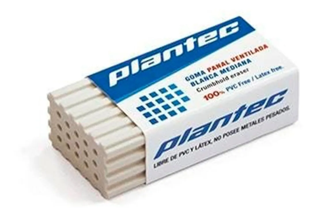 Este pack incluye 3 gomas panal ventiladas de la marca Plantec. Estas gomas de alta calidad cuentan con un diseño original con perforaciones y ranuras que aseguran una superficie de borrado eficiente y controlada. Además, su diseño permite eliminar de manera más sencilla los restos de goma. Cada goma viene con una vaina impresa y protegida con un film transparente. Sus dimensiones son de 50 x 24 x 16 mm y su peso unitario es de 27 gramos. Estas gomas están libres de PVC y Látex, y no contienen metales pesados.