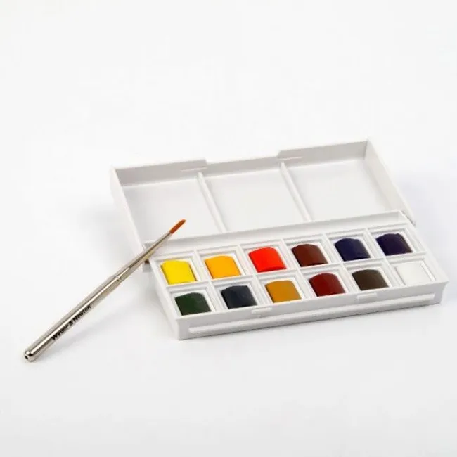 El set contiene de 12 medias pastillas de acuarela y un pincel de alta calidad, ésto se encuentran alojadas en una caja plástica que ha sido diseñada para ser usada como paleta.