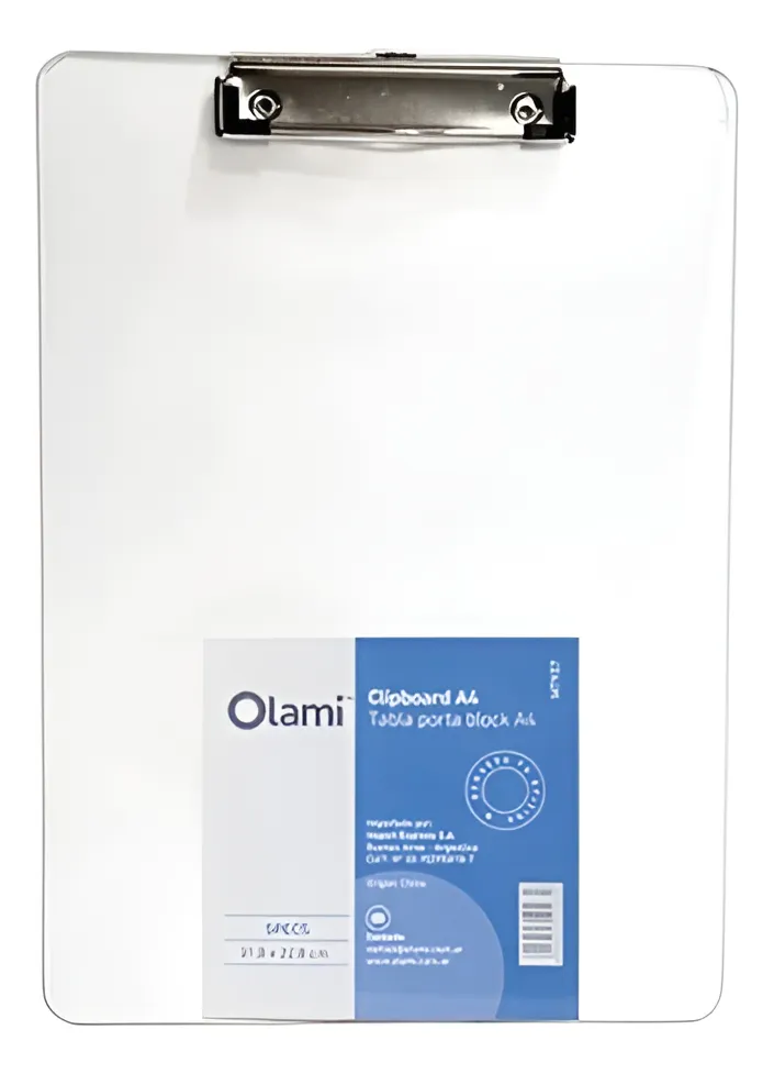 La Tabla Porta Block Clipboard A4 Olami es el accesorio ideal para mantener tus documentos organizados y seguros. Con unas dimensiones de 31,8 x 2,8 cm, está diseñada específicamente para hojas tamaño A4. Fabricada en plástico resistente, esta tabla cuenta con un clip de metal robusto que asegura tus papeles firmemente. El modelo MT907 de Olami es perfecto para estudiantes, profesionales y cualquier persona que necesite una solución práctica y duradera para tomar notas o presentar documentos. Su espesor de 2 mm le proporciona la rigidez necesaria sin ser voluminosa. Todas las imágenes son ilustrativas.