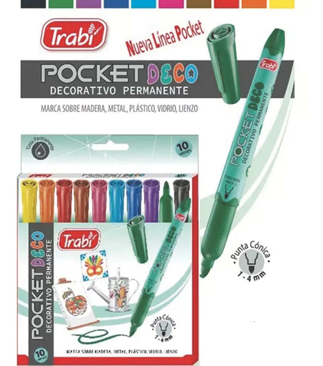 Descubre el 'Marcador Permanente Trabi Pocket Deco x 10 Colores', una herramienta esencial para tus proyectos creativos. Este set incluye 10 marcadores de alta calidad, perfectos para una variedad de superficies, gracias a su diseño versátil. Cada marcador cuenta con un cuerpo de plástico resistente y una punta cónica que permite un grosor de trazo de 1 a 4 mm, ideal para detalles precisos o trazos más amplios. La tinta permanente garantiza que tus creaciones se mantendrán vibrantes y duraderas, aunque no es lavable ni a prueba de agua. Presentados en una práctica caja, estos marcadores son perfectos para artistas, estudiantes y aficionados al arte. Con la marca Trabi, puedes confiar en la calidad y el rendimiento de cada unidad. ¡Deja volar tu imaginación y dale vida a tus ideas con el set de marcadores Trabi Pocket Deco!