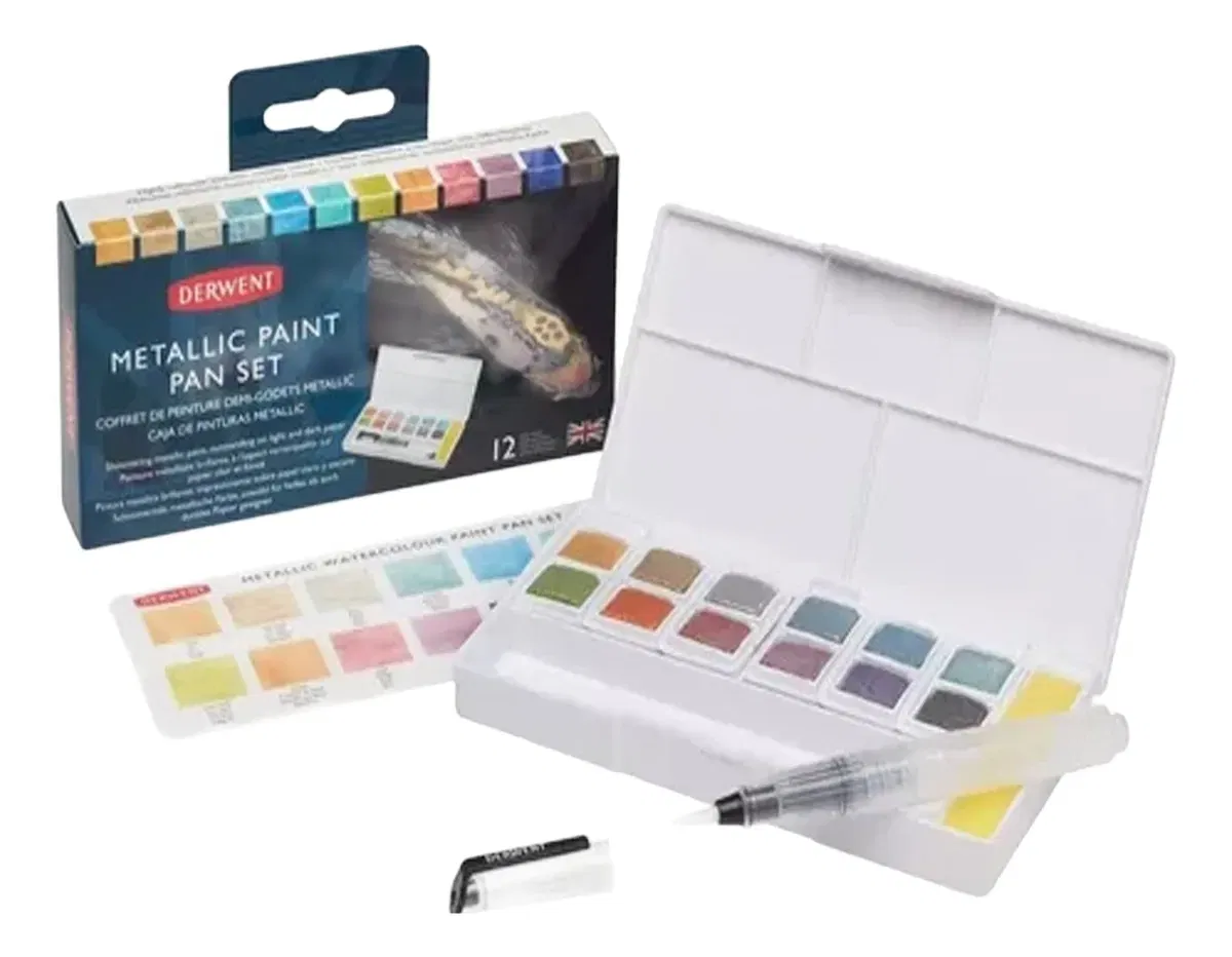 Las bandejas de pintura metálica Derwent contienen un color metálico brillante, que se destaca cuando se aplica tanto en papel claro como oscuro. Esta gama de colores altamente reflectantes ofrece un amplio espectro de colores metálicos. Impresionante en superficies blancas y negras, el juego de bandejas de pintura metálica Derwent incluye 12 tonos únicos que se mezclan maravillosamente para crear un espectro completo de colores metálicos. Los pigmentos metálicos extrafinos dan un brillo reflectante, manteniendo su brillo una vez secos. Aplicar con trazos cremosos y opacos, en capas y difuminar en la página. Adecuado para una variedad de proyectos de artesanía o bellas artes. Contiene 12 bandejas de pintura metálica, un mini cepillo de agua, una esponja y cinco paletas de mezcla.