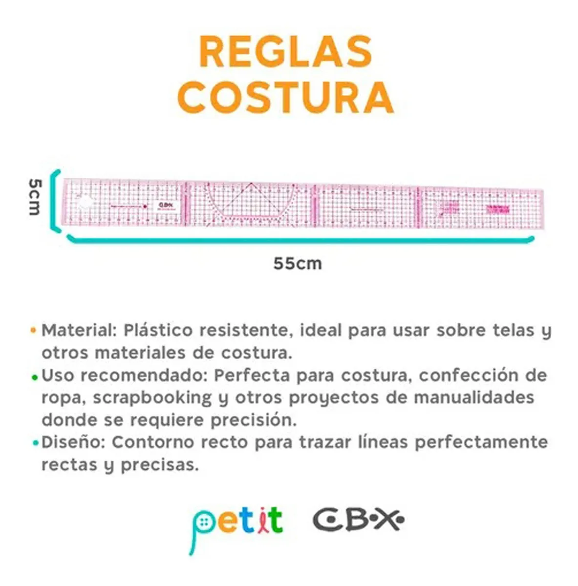 Las Reglas Patchwork b55 CBX son una herramienta esencial para los amantes de la costura y el diseño textil. Con unas dimensiones de 55 x 5 cm, estas reglas están diseñadas para facilitar la creación de patrones precisos y detallados, permitiendo que cada proyecto de costura sea un éxito. Fabricadas por CBX, garantizan durabilidad y precisión en cada uso.