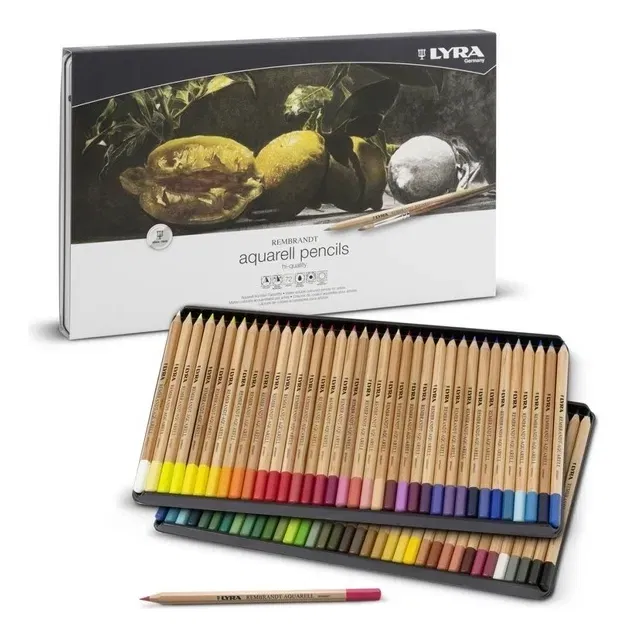 Los lápices profesionales y acuarelables Lyra Rembrandt Aquarell son de colores intensos y brillantes con pigmentos muy resistentes a la luz, por lo que se pueden usar para todas las técnicas de dibujo. Como la mina extra grande es excepcionalmente acuarelable, es posible lograr sorprendentes efectos acuarela, pudiéndose mezclar y difuminar los colores fácilmente.