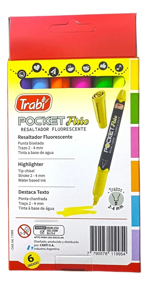 Resaltador Fluorecente Trabi Pocket Fluo x 6 colores -Punta Biselada 2 - 4 mm -Tinta a base de agua