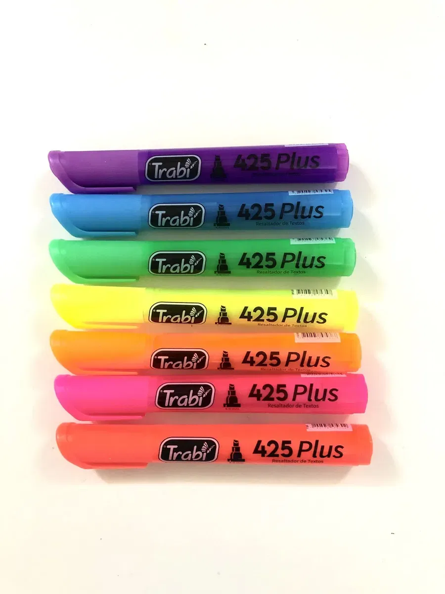 Resaltadores Trabi 425 Plus en caja de 6 unidades con colores flúo variados: amarillo, verde, rosa, naranja, violeta, celeste. Estos resaltadores cuentan con tinta al agua que proporciona colores intensos y brillantes. Su punta biselada permite realizar trazos de 4mm y 6mm dependiendo de cómo se apoye la punta en el papel. Incluyen un sistema CAP OFF que permite dejar el resaltador sin capuchón hasta 48 horas sin que se seque. Además, su capuchón es ventilado e incluye un clip. Se trata del resaltador Trabi de mayor duración.