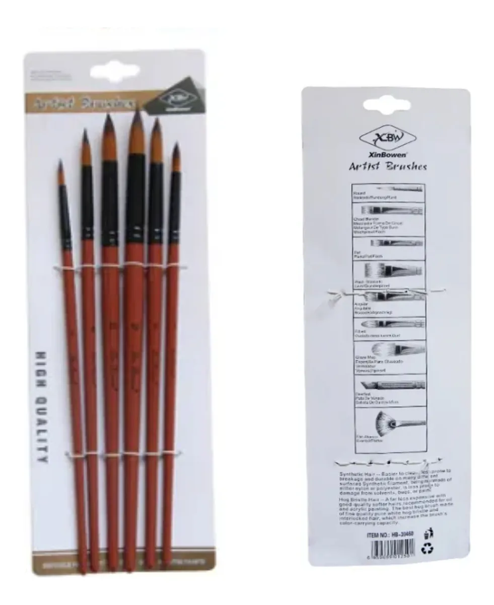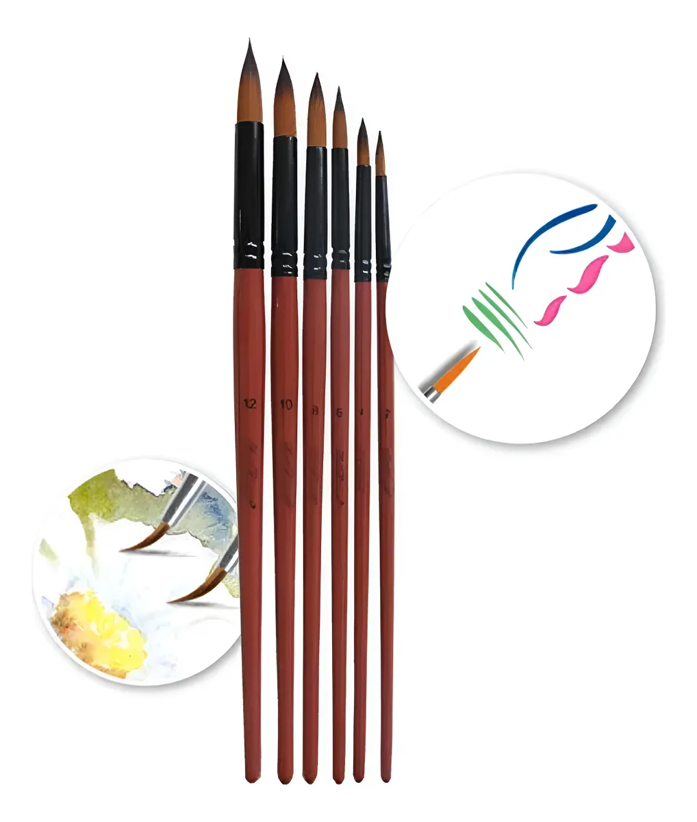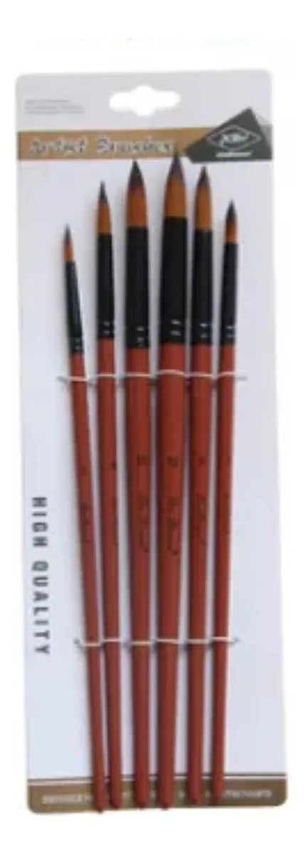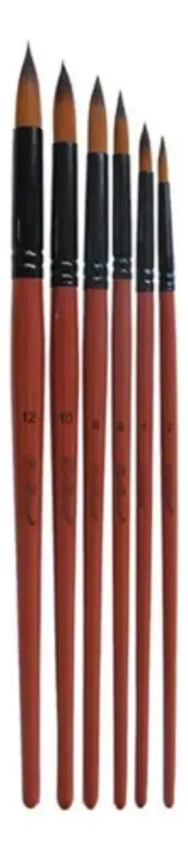 Pinceles artísticos redondos con cerdas super suaves. Ideales para utilizar con oleo, acrilico o incluso latex. Medidas 2, 4, 6, 8, 10 y 12. Mango de madera y cerdas sinteticas. Los mangos miden entre 17,5 y 20 cm de largo. Virola metálica, bien firme, no pierde pelos! Resistentes a trementina, thiner, aguarraz y otros solventes. Gran durabilidad.