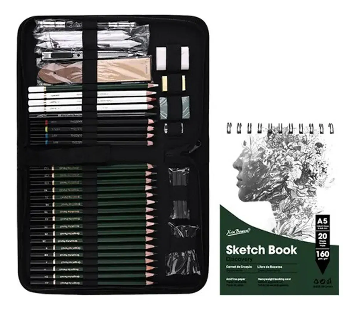 Descripción Juego de 43 lápices de dibujo Xin Bowen para dibujar, incluye lápices de carboncillo, cuaderno de bocetos, lápices, carboncillo, grafito y talla grande para artistas, profesionales o principiantes El kit incluye: 17 lápices : F x 1und / B x 1und / 2H x2und / 4H x1und / 6H x1und / HB x1und / 2B x2und / 4B x2 und 6B x2und / 8B x2 und / 10B x1und / 2B x1 und 6B Grafito sin madera 1 und Lápiz de carbón suave 2 und Lápiz carboncillo mediano 1 und Lápiz de carbón duro 1 und. Lápiz carboncillo blanco 1 und Lápiz de carbón para cejas 1 und. Lápiz carboncillo café 1 und Borrador lápiz 1P Herramienta de papel de lija 1 ud. Trincheta de arte 1 pieza difuminador de papel 3PCS Extensor de lápiz 1 ud. Grafito comprimido 3PCS Carbón comprimido 3PCS Sacapuntas Borrador 2 uds. Borrador amasable 1 ud. un block A5